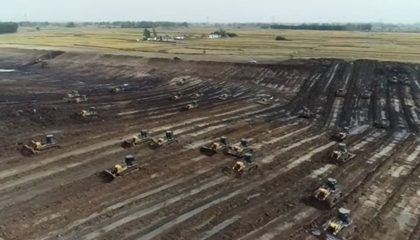 山東某河道施工工地,使用近10臺山推推土機(jī)進(jìn)行土方作業(yè)。