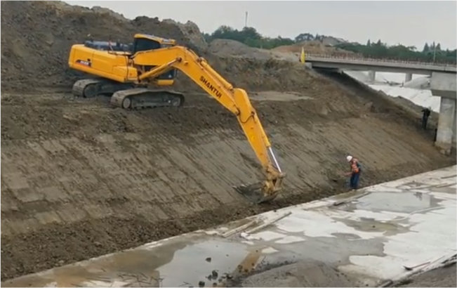 山東省內(nèi)某河道開(kāi)挖施工,山推SE215高效修坡施工,操控輕便、控制精準(zhǔn),精細(xì)化修坡作業(yè)。