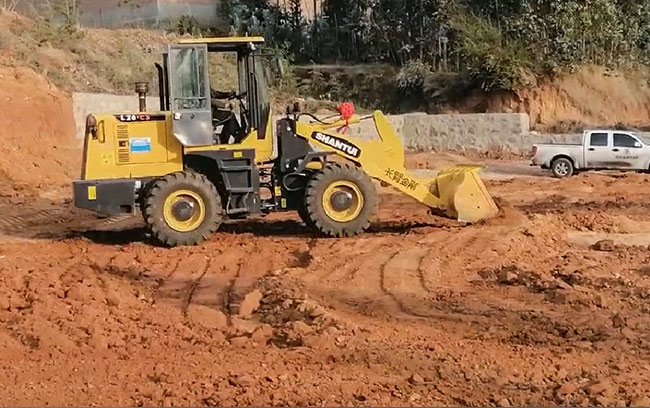 某廠房建筑工地進行土方鏟裝,地面平整作業(yè),整機靈活性高,油耗低,燃油經濟性好,工作效率高。