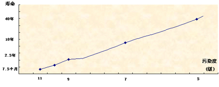 世界各研究機(jī)構(gòu)在進(jìn)行研究污染度對壽命的影響時(shí),所給出的研究結(jié)果差異很大,這主要是因?yàn)楣ぷ鳝h(huán)境、污染物成分及顆粒硬度等因素不同的結(jié)果。一般來說(以NAS1638標(biāo)準(zhǔn)),污染度降低一級,壽命延長一倍,反之亦然。假定使用污染度為7級(NAS1638)的油液,機(jī)器的壽命為10年,同樣是這樣一臺(tái)機(jī)器將油液的污染度降低幾級,壽命就有驚人的變化。